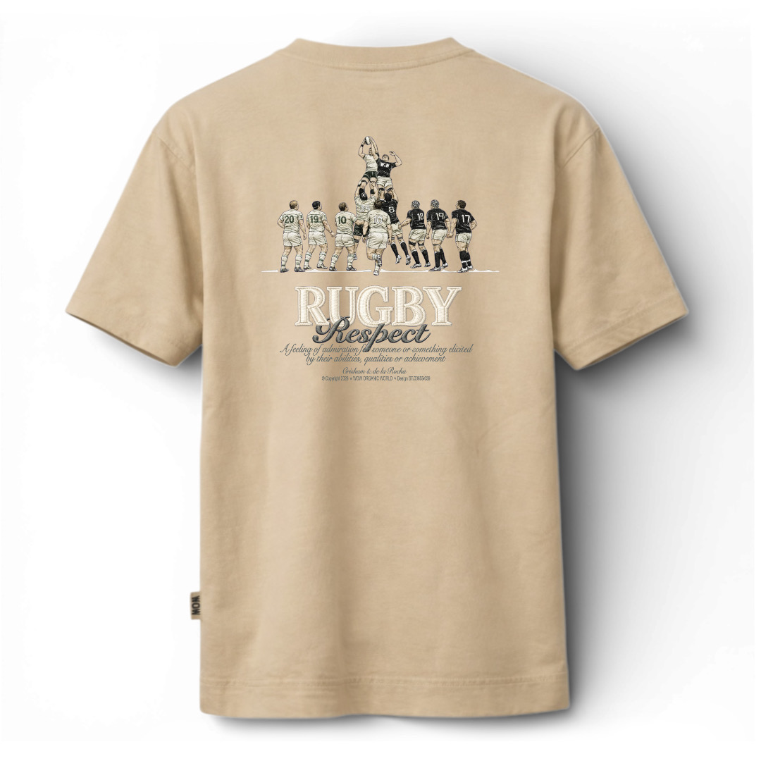 Camiseta unisex de manga corta en color arena. Confeccionada en 100% ALGODON ORGANICO. Cuello redondo y costuras dobles en los hombros. Corte urban con parte trasera ligeramente más larga.